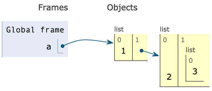[1, [2, 3]] # 첫 번째 리스트의 index 0, 1에 값이 들어 있는 형태
