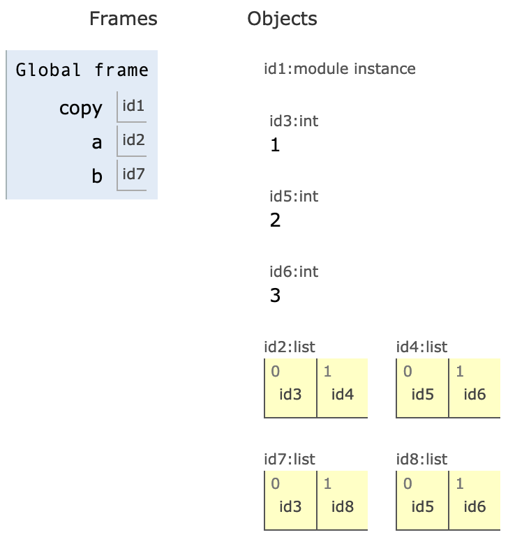 위의 방법으로 복사가 되었지만 주의사항이 있음. 리스트 값 중에 mutable(가변) 값이 있고 그 값이 변경되면 복사된 모든 리스트에 적용됨. 예를들어 위의 예시를 보면 복사를 통해서 리스트가 새로 만들어 졌지만 위 그림을 보면 각 리스트의 같은 index 값들은 같은 int 클래스의 인스턴스 오브젝트 주소 정보를 참조하고 있음. 그러나 integer나 string은 immutable(불변)의 값 이기 때문에 아래와 같이 변수 a 리스트에서 값을 변경해도 다른 리스트에는 영향이 없음